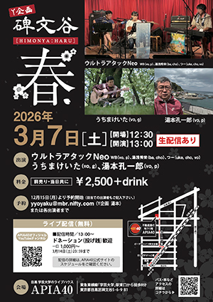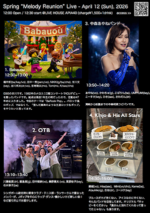 出演:高井つよしクィンテット(vo,eg/eg/ba/p,cho/dr)、 山姥(vo,ba)from広島、 真理(vo,p)、 坂進(vo,g)