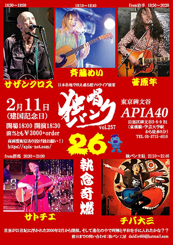 出演:チバ大三(vo,g)、 サトチエ(vo,g)、 菅原年(vo,g)、 斉藤めい(vo,g)、 サザンクロス(vo,g)