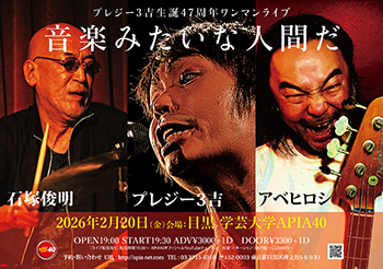 出演:プレジー3吉(vo,g)from三重 ゲスト:石塚俊明(dr/頭脳警察), アベヒロシ(ba)